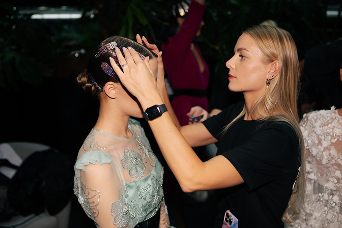 Kolekcijos įvaizdžiai spinduliavo eleganciją ir šiuolaikiškumą. Pagrindiniai stiliaus akcentai – šlapias plaukų efektas, tvarkingai sušukuoti kuodukai ir blizgantys segtukai – subtiliai perteikė aukštosios mados dvasią, puikiai atspindėdami rudens pradžios energiją ir grįžimo į ofisą nuotaikas.