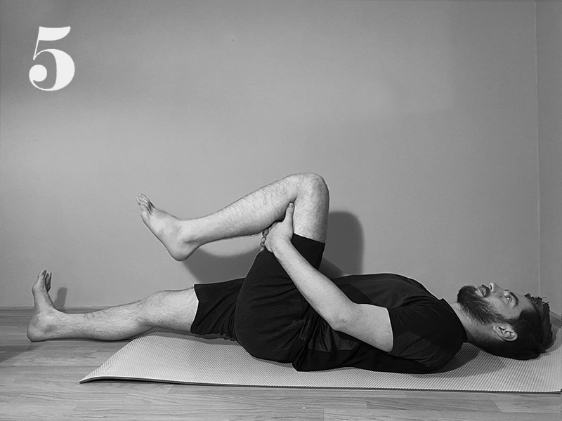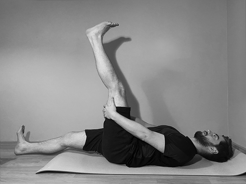 Gulint ant nugaros, viena koja ištiesta, kitą koją imti rankomis už šlaunies. Laikomą koją lenkti ir tiesti per kelio sąnarį. Svarbu, kad tempimo metu turi būti iškvepiama. Jeigu apatinėje nugaros dalyje jaučiamas diskomfortas, apatinę koją galima sulenkti. Pratimas skirtas didinti galinės kojų raumenų grupės mobilumui ir atpalaiduoti įsitempusiems raumenims. Su kiekviena koja atliekama po 10 kartų.