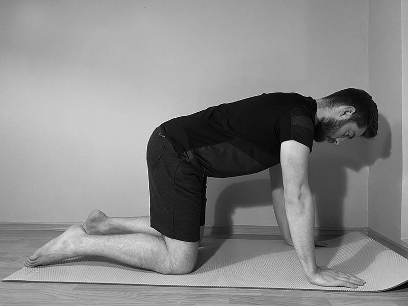 efektyviausia gulint, tačiau galima atlikti ir sėdint. Gulint kojos sulenktos, viena ranka uždėta ant pilvo, kita – ant krūtinkaulio. Kvėpavimas: įkvėpimo metu pilvas išpučiamas, iškvėpimo metu įtraukiamas į save. Rankomis jaučiame, kad krūtinė kvėpavimo metu nejuda, o tuo metu juda tik pilvas. Pratimas skirtas visam kūnui atpalaiduoti ir apatinės nugaros dalies skausmui ar nuovargiui sumažinti. Kvėpavimo pratimas iš pradžių atliekamas 10 kartų. Svarbu, kad nepradėtų svaigti galva.