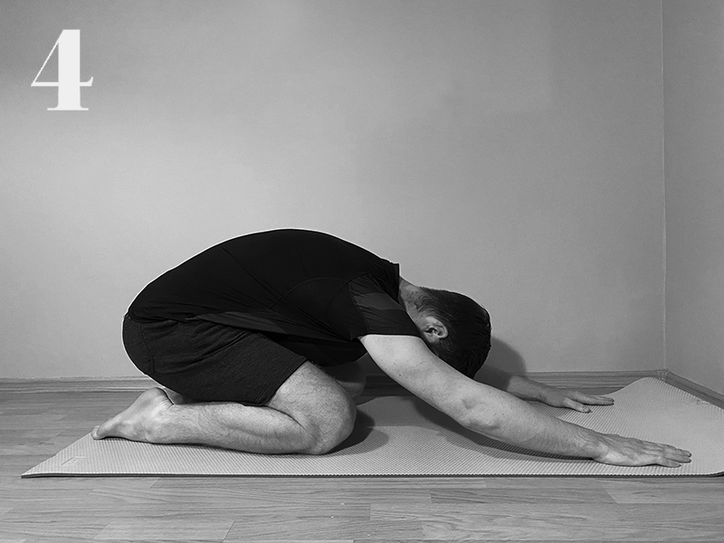 Ši poza skirta atpalaiduoti apatinei nugaros daliai. Atsistojus į keturpėsčią padėtį, rankas atremti po pečiais į žemę ir sėsti ant kulnų. Tokią padėtį išlaikyti apie 1 minutę. Stengtis visiškai atsipalaiduoti visu kūnu ir ramiai kvėpuoti.