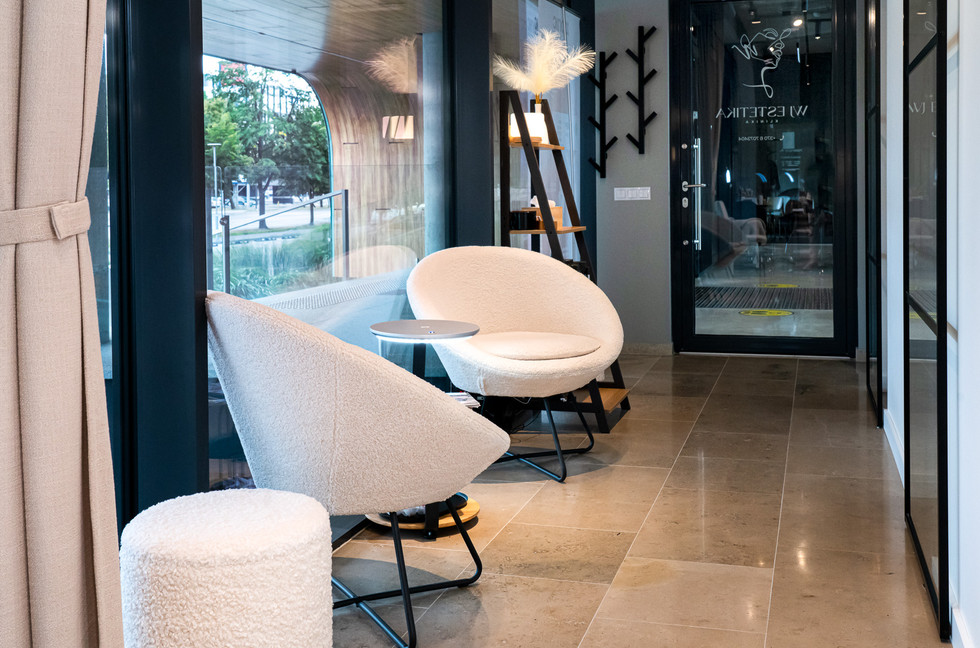 WJ Estetikos klinikos interjerą formuoja niuansinės sienos ir paviršiai, juodi ortakiai ir užuolaidų karnizai, apšviesti veidrodžiai, svarbų akcentą kuria ryškus neoninis logotipas. Vytautei visus sumanymus padėjo įgyvendinti vyras. O norėdama pademonstruoti, kad klinikoje nebūtinai turi būti tik sterilios baltos sienos, ji naudojo grynas medžiagas, kurios įneša jaukumo ir ryšio su gamta. Interjere nemažai tekstilės, kuri darniai įsilieja ir suteikia minkštumo. Užuolaidos atlieka kelias funkcijas – suteikia privatumo, sugeria garsus ir atskiria erdves. Tad nedideliame plote puikiai išsitenka specialistai, o klientai vertina aplinkos jaukumą ir išskirtinumą.